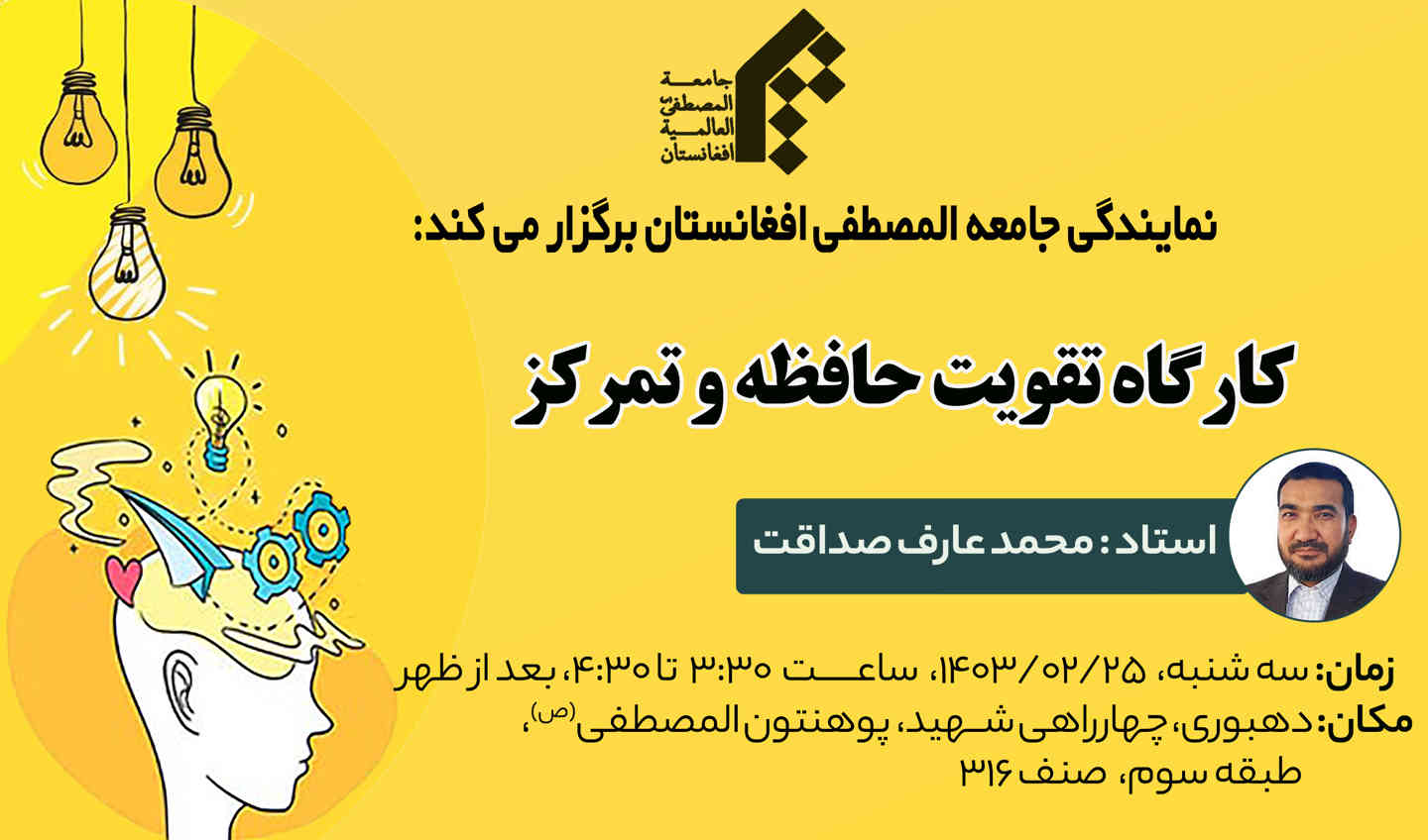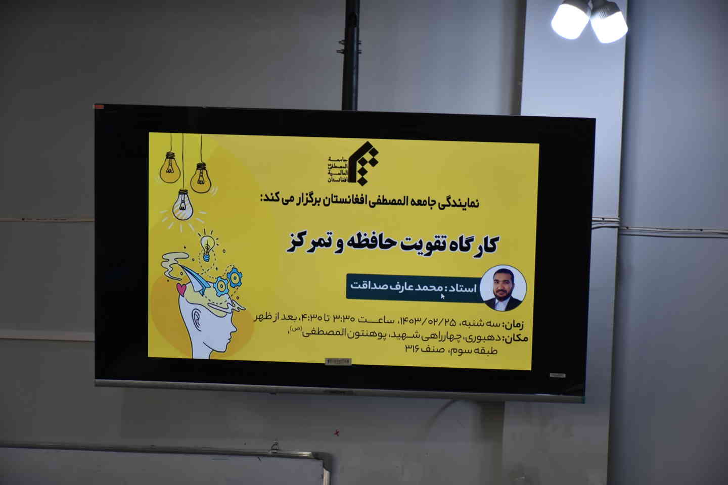خلاصه گزاش: کارگاه تقویت حافظه و تمرکز در پوهنتون جامعه المصطفی(ص)- افغانستان در طبقه سوم صنف 316 برگزار شد این کارگاه توسط استاد محمد عارف صداقت ارائه شد, در ابتداء از تشریف آوری حاضرین و محصلین تشکری نموده و موضوع بحث را مطرح نمود. در آغاز تعریف کلی از حافظه صورت گرفت و بعد پیرامون موضوعات تقویه حافظه و انواع حافظه و چگونگی حفظ کردن به محصلین ارائه شد, که مهمترین آنها قرار ذیل است.