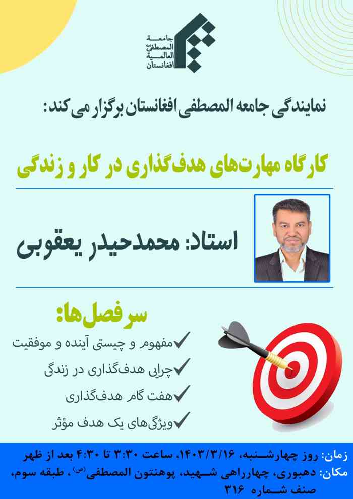 خلاصه گزاش: کارگاه هدف گذاری در کار و زندگی در نمایندگی جامعه المصطفی(ص) – افغانستان تاریخ 16/03/1403 برگزارشد این کارگاه توسط استاد محمدحیدری یعقوبی ارائه گردید، در ابتداء استاد یعقوبی از تشریف آوری اشتراک کنندگان و دانشجویان اظهار قدر نموده و آنها را خوش آمدید گفتند و در ادامه در مورد مطالب ذیل بیان فرمودند: