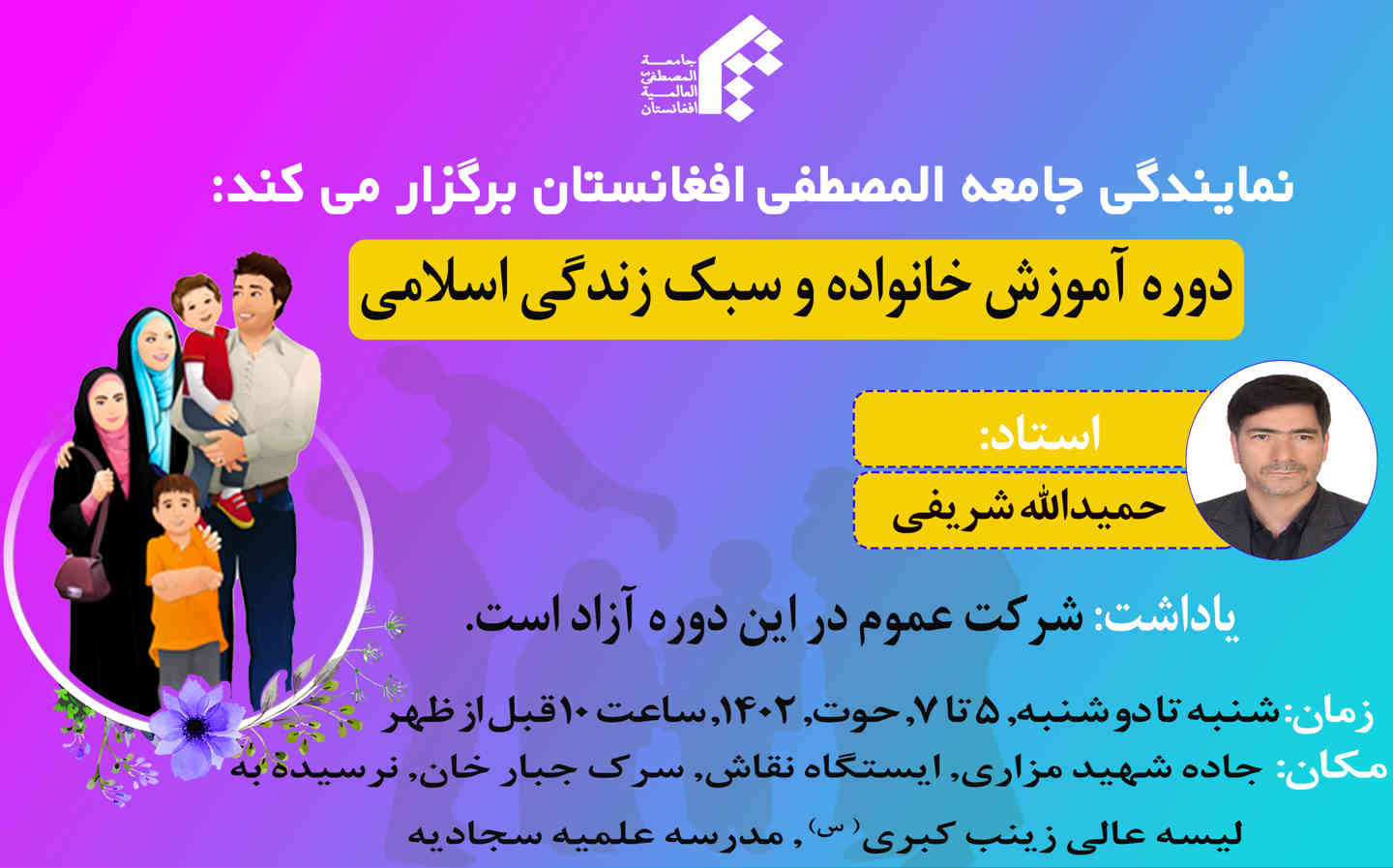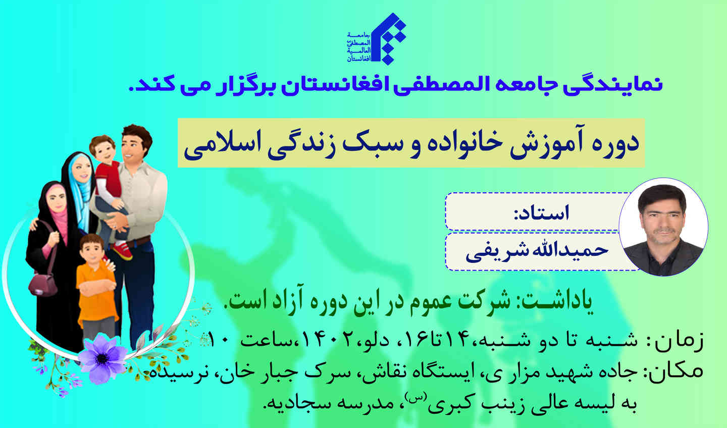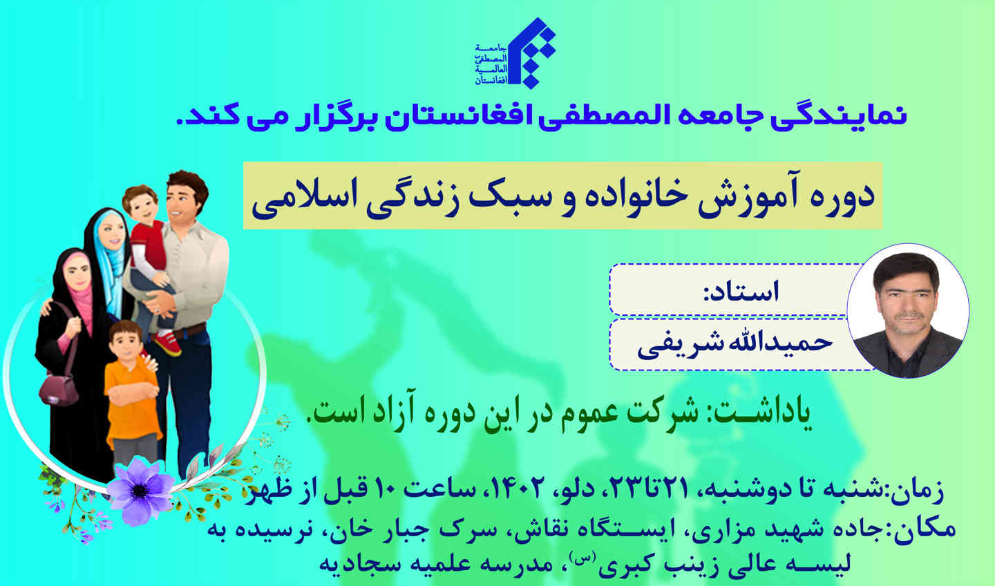 دروه آموزش خانواده و سبک زندگی اسلامی توسط جامعه المصطفی (ص) نمایندگی- افغانستان با همکاری مدرسه علمیه سجادیه در تاریخ های 14 تا 16, 21تا 23 دلو و از 5 تا 7 ماه حوت سال 1402 طی سه دوره و 16 جلسه موفقانه برگزار شد. این دوره توسط استاد حمیدالله شریفی ارائه شد. در هر جلسه ای دوره به تعداد 48 طلاب خواهر و اشتراک کنندگان آزاد حضور داشتند مباحث ارائه شده قرار ذیل است.