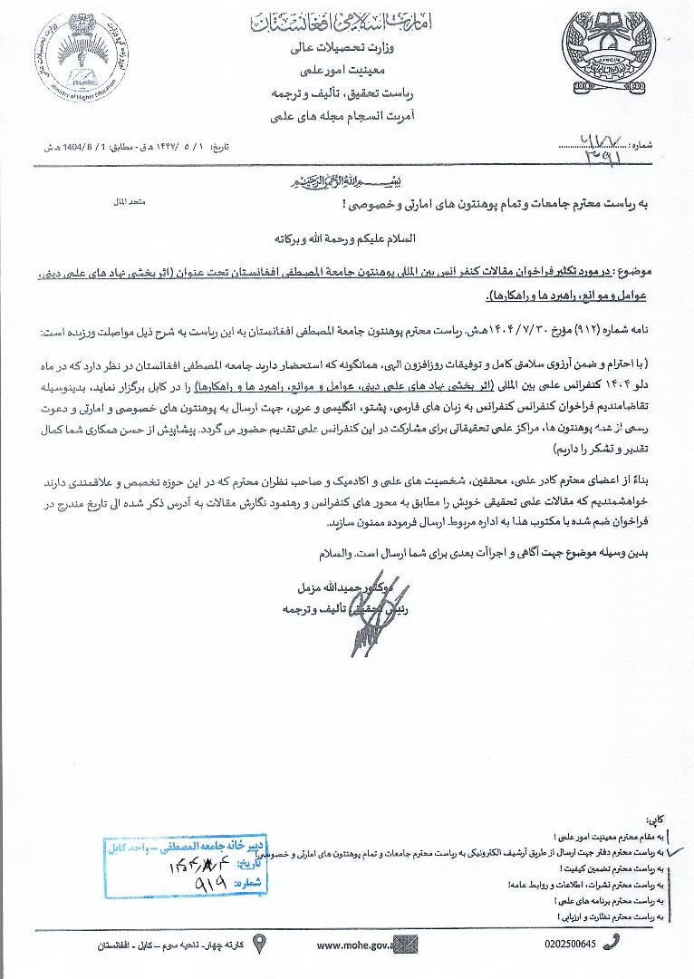 آدرس دبیرخانه همایش: کابل، دهبوری، چهارراهی شـهید،
